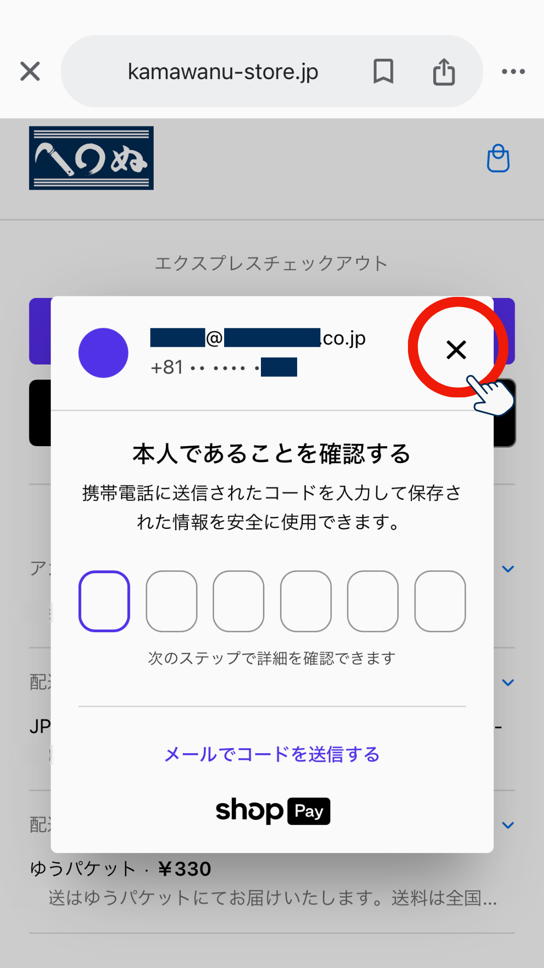 購入手続き画面に進むと、Shop Payから、SMSで受け取った認証コードの入力を求められますが、Shop Pay以外の決済を希望される場合は、本人確認をせずに右上の「×」を押して、他の決済方法を選択してください。
