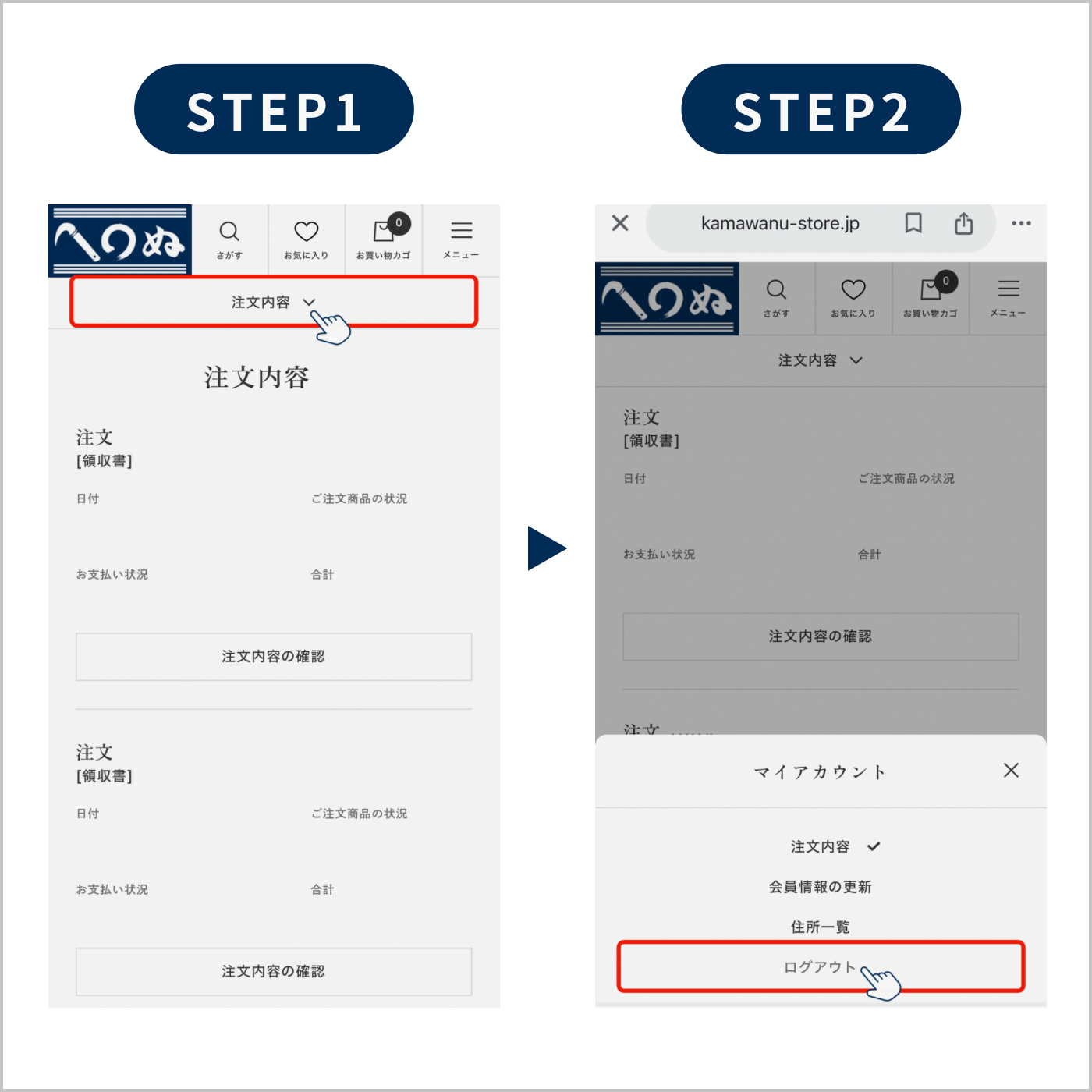 2.メニューバーアイコン(さがす、お気に入り、お買い物カゴ、メニュー)の直下にある「注文内容∨」というボタンがございますので、ボタンを押してください