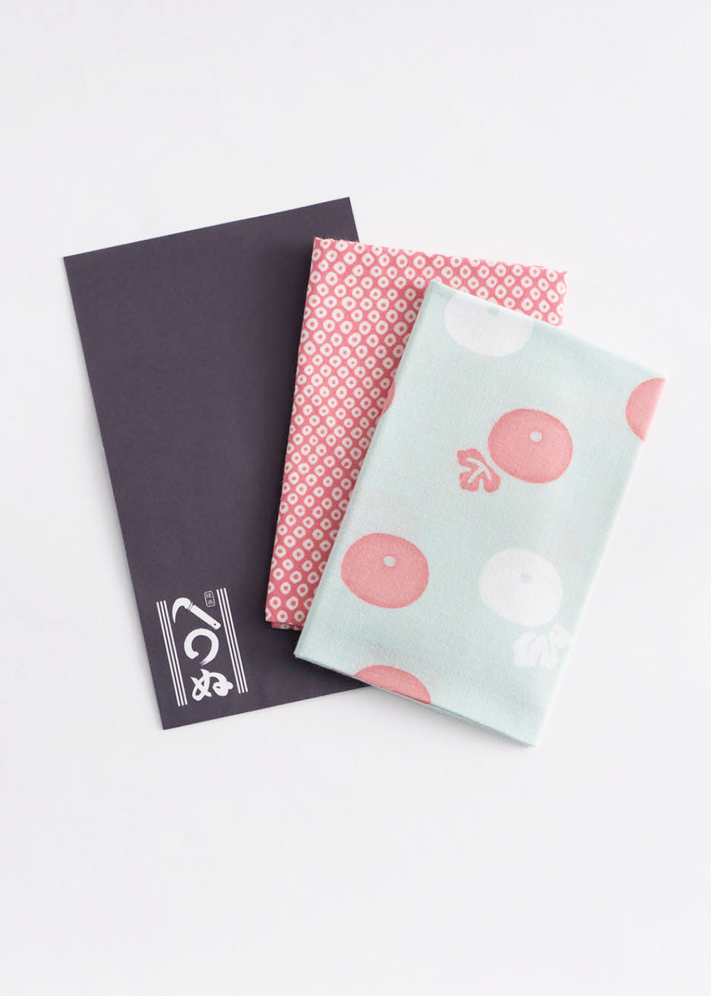 (例)地染め豆絞り 紺1枚、麻の葉 小 赤1枚のてぬぐいをセット。他自宅用。