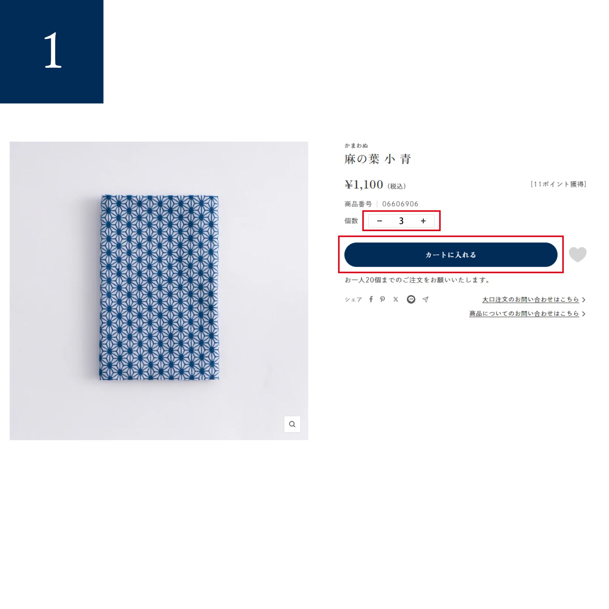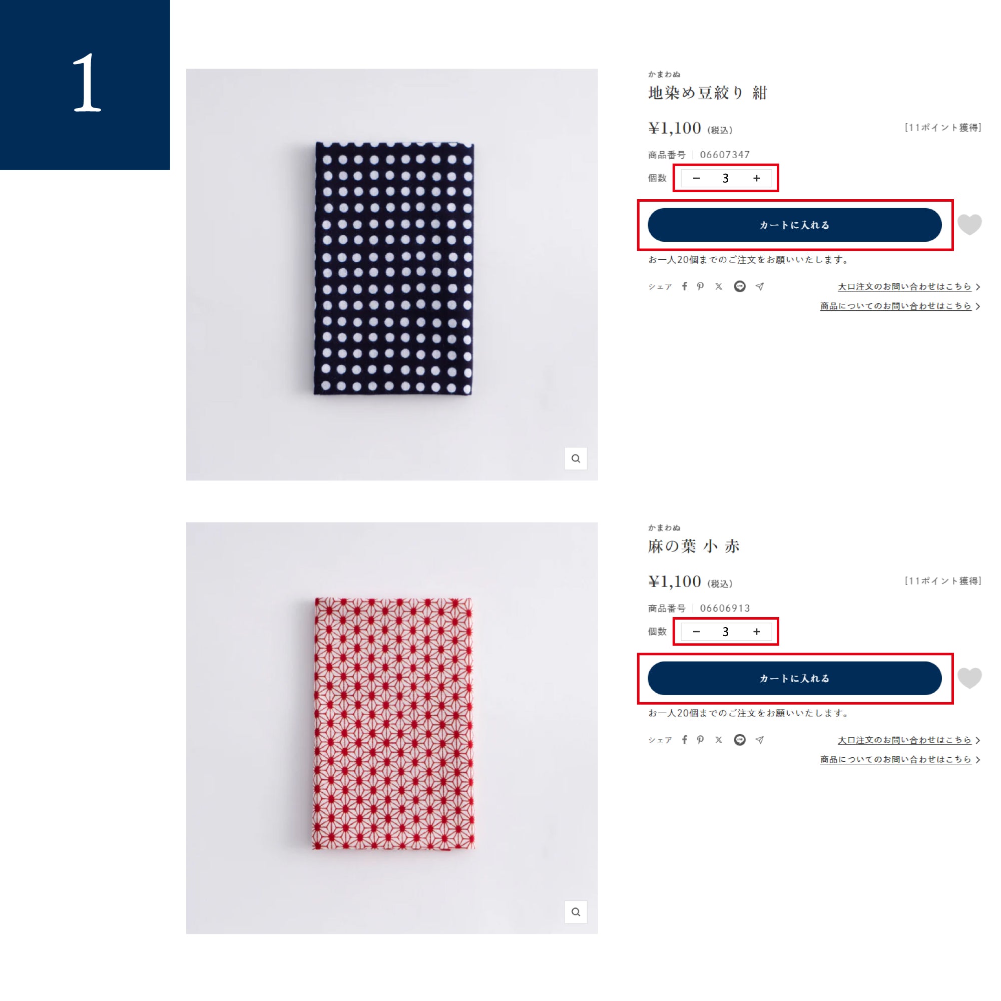 入力が終わりましたら、数量を1のまま、「カートに入れる」ボタンを押してください。