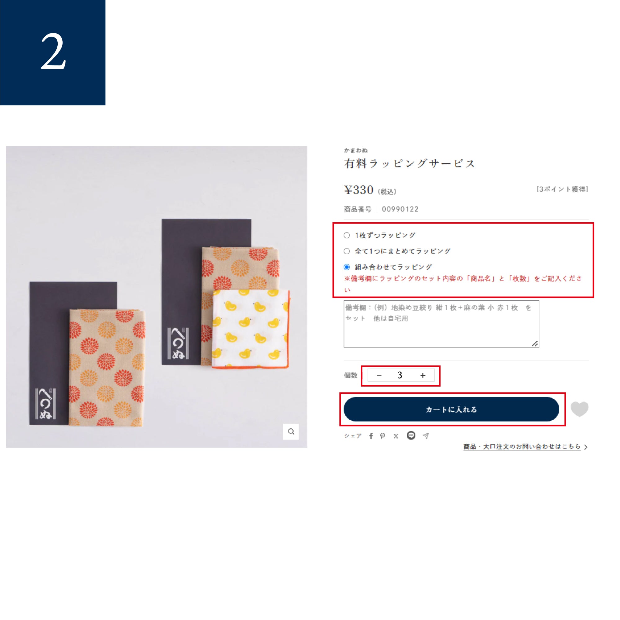 有料ラッピングサービスの商品ページにて、包装の方法をボタンで選択する。「1枚ずつラッピング」と「全てを一つにまとめてラッピング」をお選びの方は、数量を1のまま、「カートに入れる」を押してください。