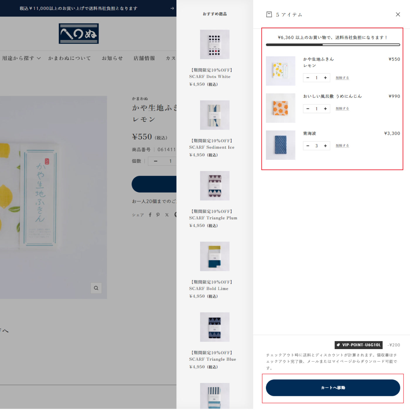 全てのご注文が終わりましたら赤枠の数量と金額をご確認ください。内容の確認が終わりましたら「カートへ移動」ボタンを押してください。