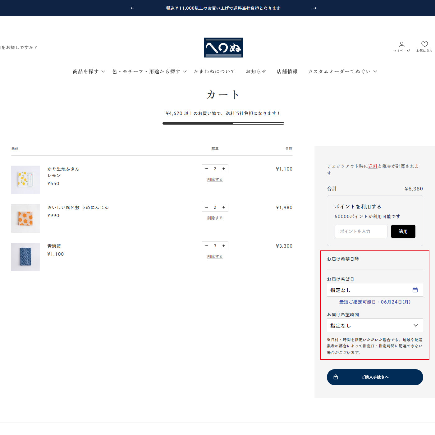 ご注文内容の合計が既定以上の場合、宅配便でのご配送となります。宅配便をご利用の場合は、赤枠の「お届け希望日時」よりお届け日時がご指定いただけます。入力後、「ご購入手続きへ」ボタンを押してください。