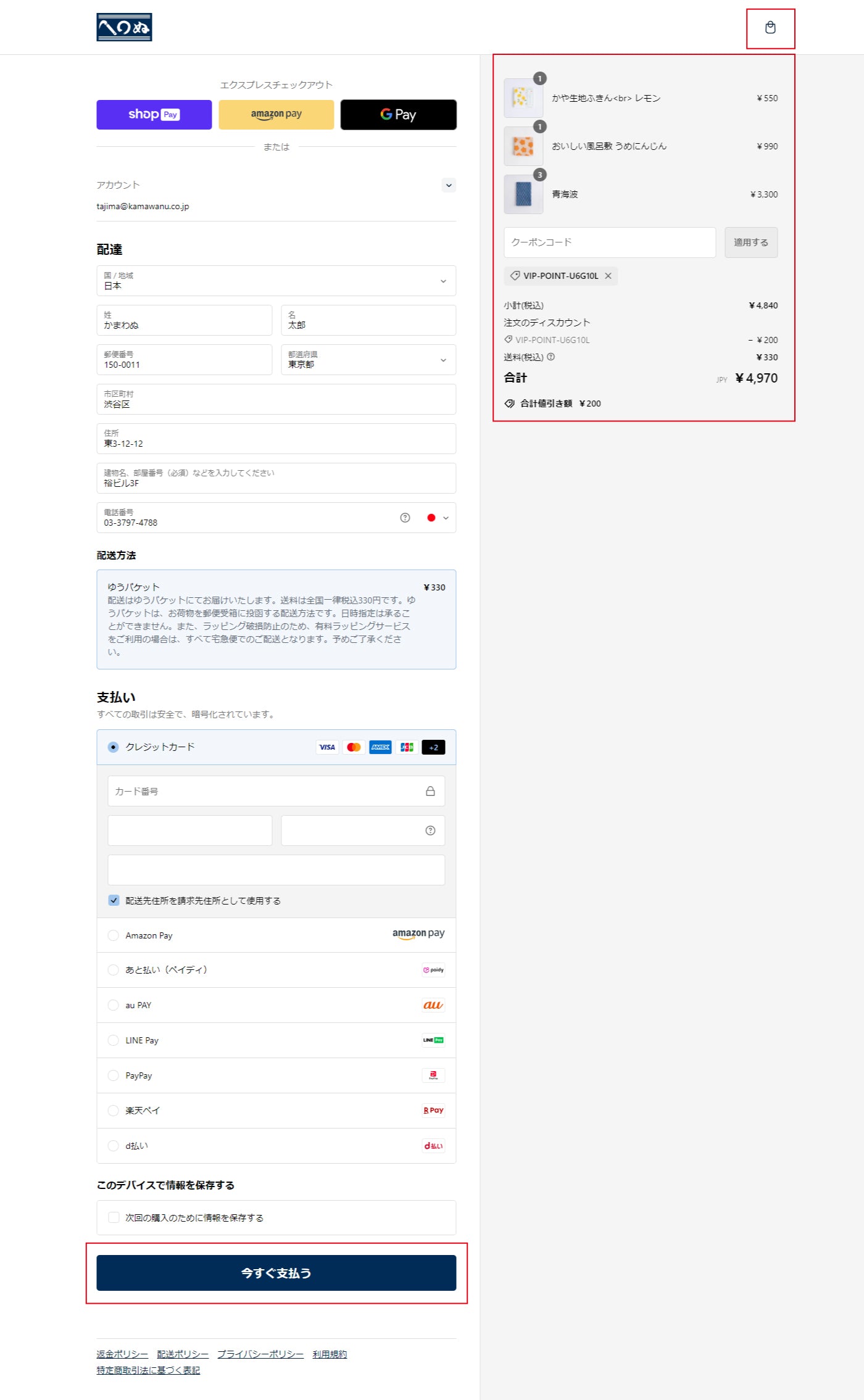 お届け先の入力、ご希望のお支払方法を選択してください。 入力後、配送料金が確定いたします。右赤枠内に表示される商品・数量・ご利用ポイント額・送料・合計金額をご確認ください。終わりましたら、左下赤枠「今すぐ支払う」を押してください。