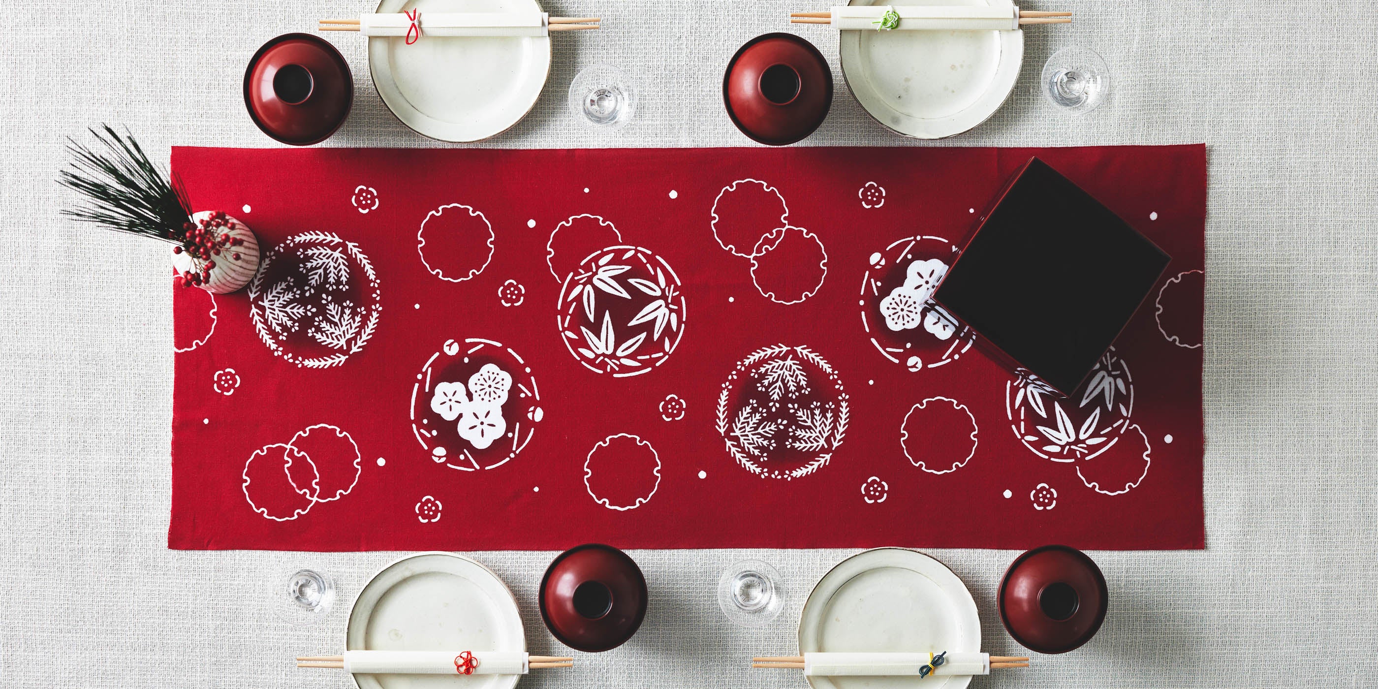 雪輪に松竹梅を配した意匠は、冬の寒さにも変わらぬ気高さと生命力を象徴する「歳寒三友」から着想を得た吉祥柄。厳しい寒中にも緑を保つ松と竹、花を咲かせる梅を讃え、古来より祝いの席を彩ってきた文様を、朱塗りの蒔絵を思わせる細やかな意匠に映しました。さらに、松竹梅のモチーフの中心には職人のぼかし染めによる繊細なグラデーションを重ね、奥行きある美を表現。端正な色づかいと静かな華やかさは、ハレの日にぴったりの1枚です。